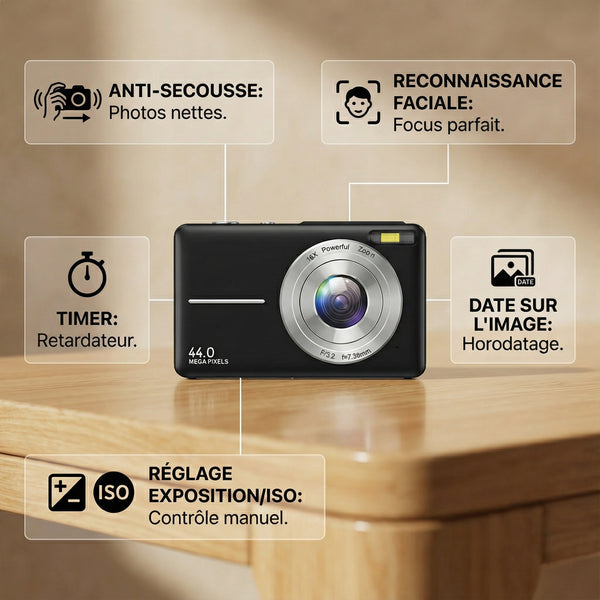 Anti-secousse, Reconnaissance faciale, Timer, Date sur l'image, Réglage Exposition/ISO
